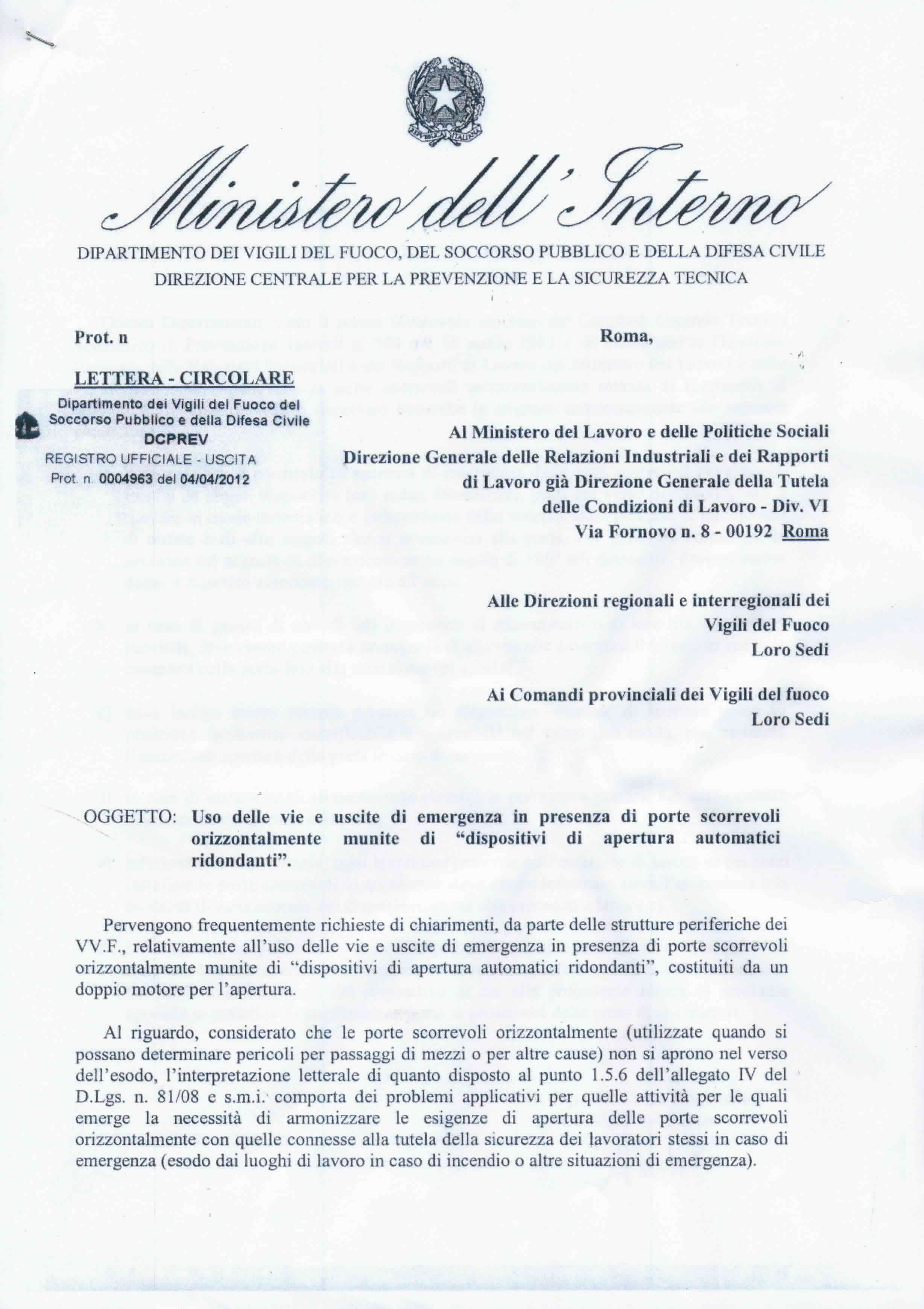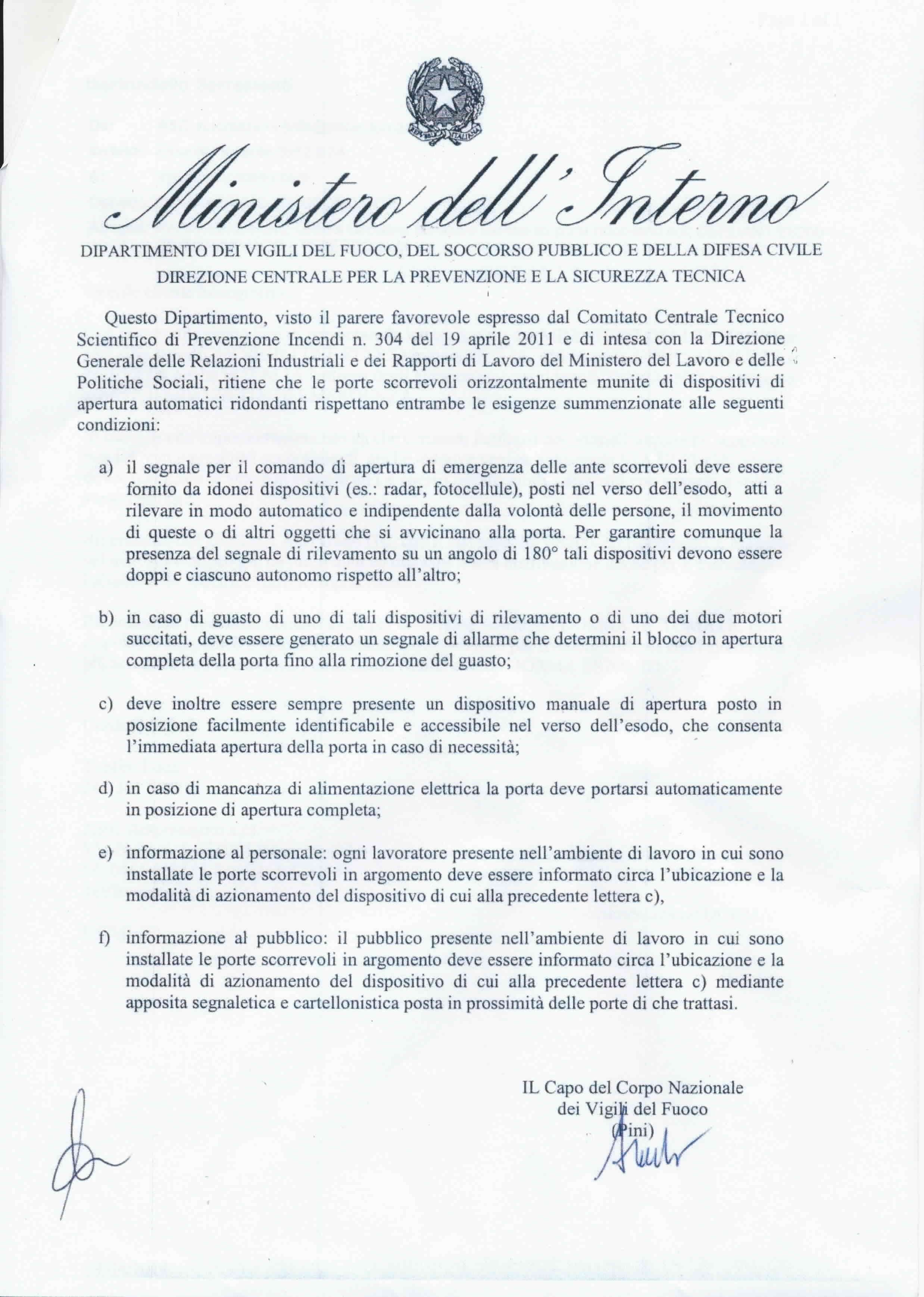 Il MINISTERO DELL’INTERNO con la lettera inviata ai vari dipartimenti dei Vigili del Fuoco in tutta Italia, accetta ufficialmente anche in Italia l’utilizzo degli automatismi cosiddetti RIDONDANTI per le porte scorrevoli nelle USCITE DI EMERGENZA.