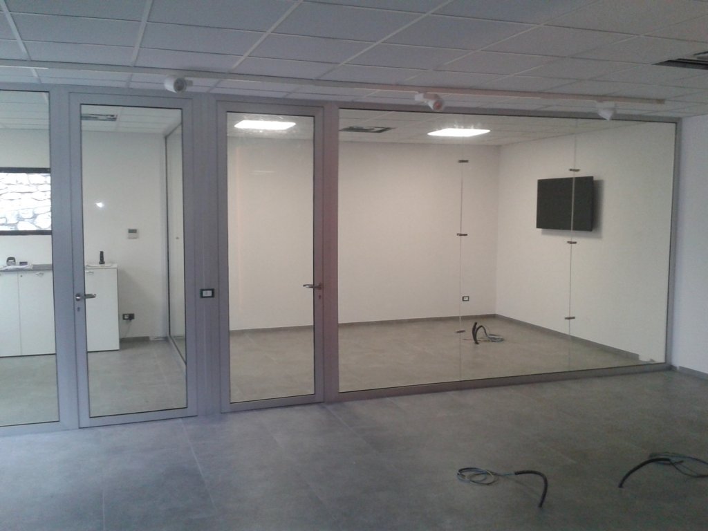 COSTRUIAMO E POSIAMO IN OPERA pareti interne vetrate per uffici e spazi commerciali, con strutture progettate a misura in base alla presenza di controsoffitti, travi in legno, muratura ecc.